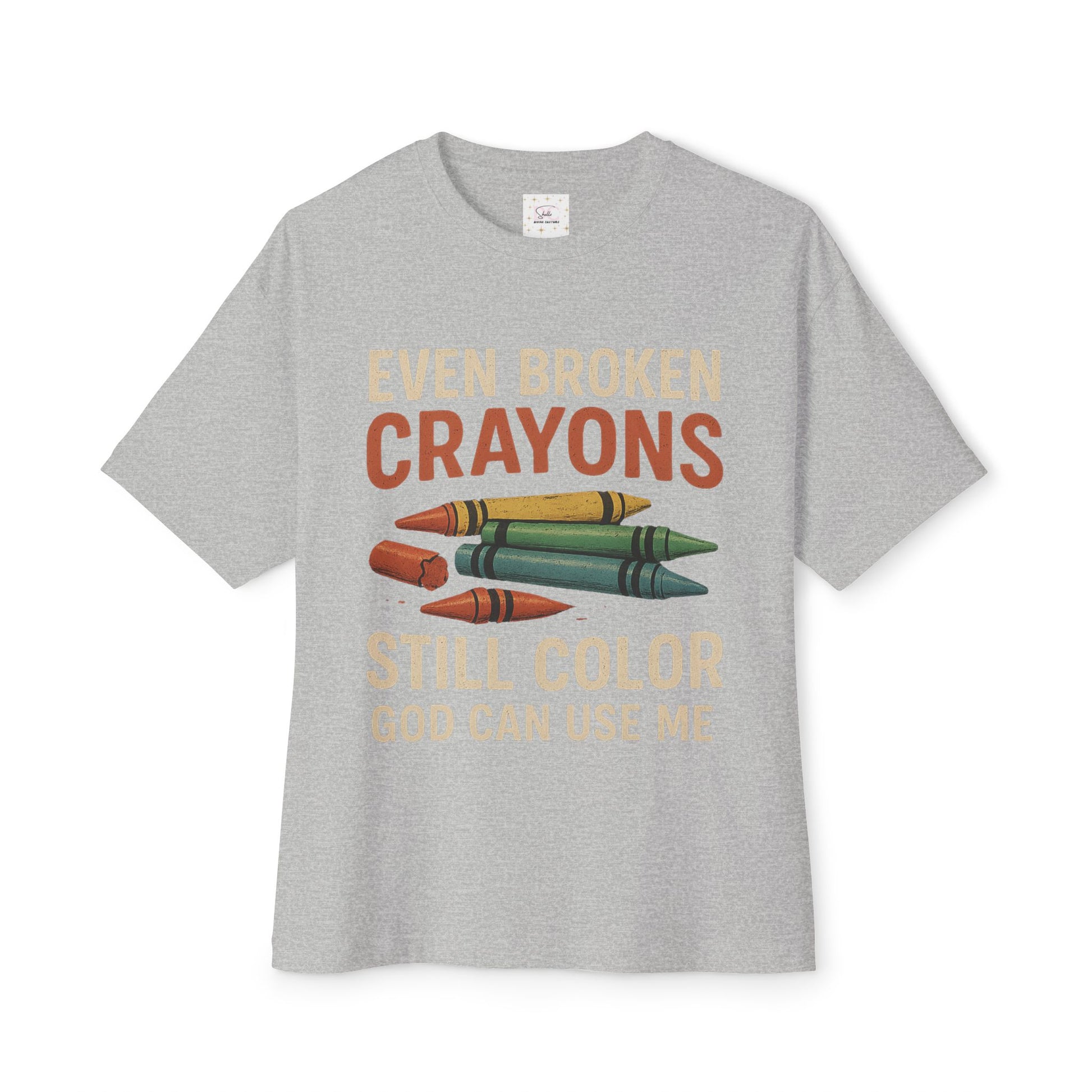 Motivational unisex oversized boxy tee featuring a design that says 'Broken crayons still color got can use yu'. This T-shirt gives a relaxed and laid-back vibe, perfect for casual everyday wear. Ideal for those seeking inspiration and positivity in their wardrobe. Relevant for casual wear, lounging, relaxation, and daily outings.